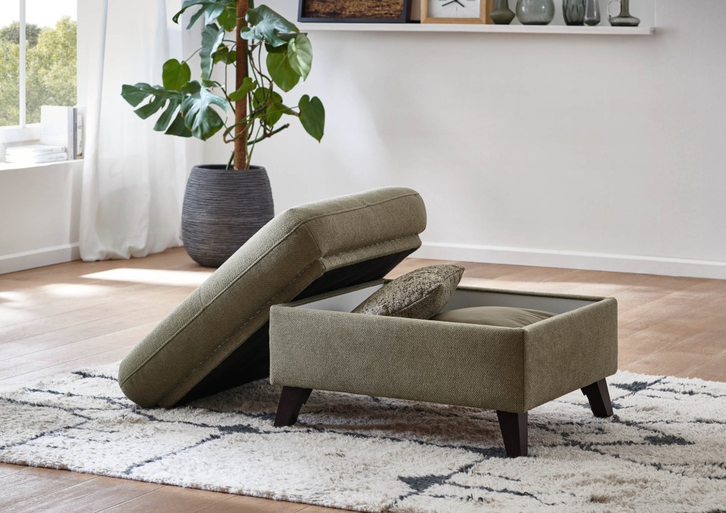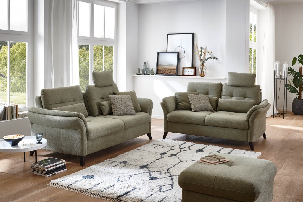 Stoff Amsterdam (Trend D-PG04), Farbe khaki, Rücken echt, Sitz Federkern, Holzfuß Buche eichefarbig geölt, Sitzhöhe 47 cm, SItztiefe 53-68 cm