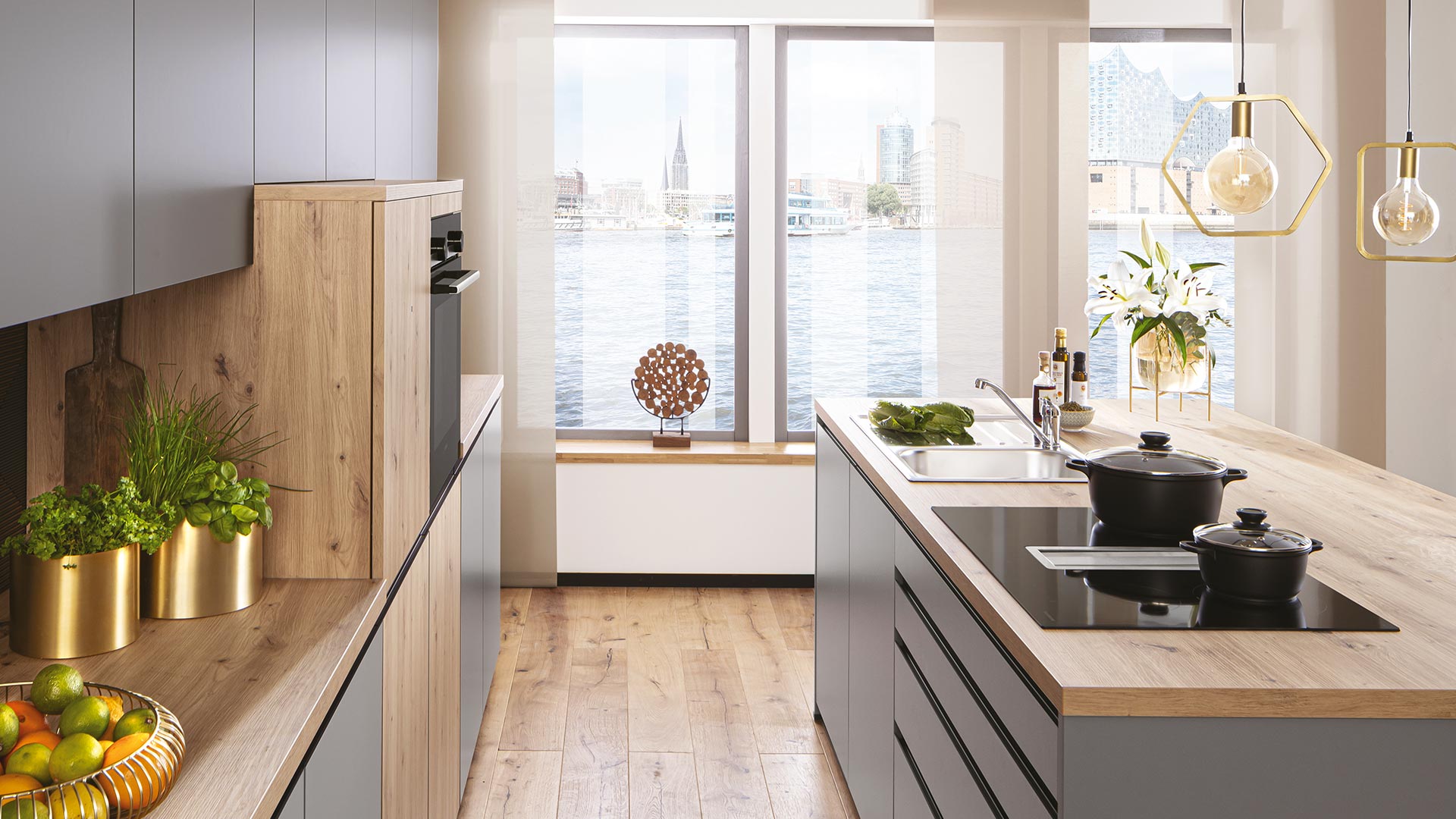 Die Trendfarbe Schwarz mit matter Optik kombiniert mit der Kochinsel und Elementen in Nussbaum-Dekor geben dieser Küche eine besonders edle Optik.